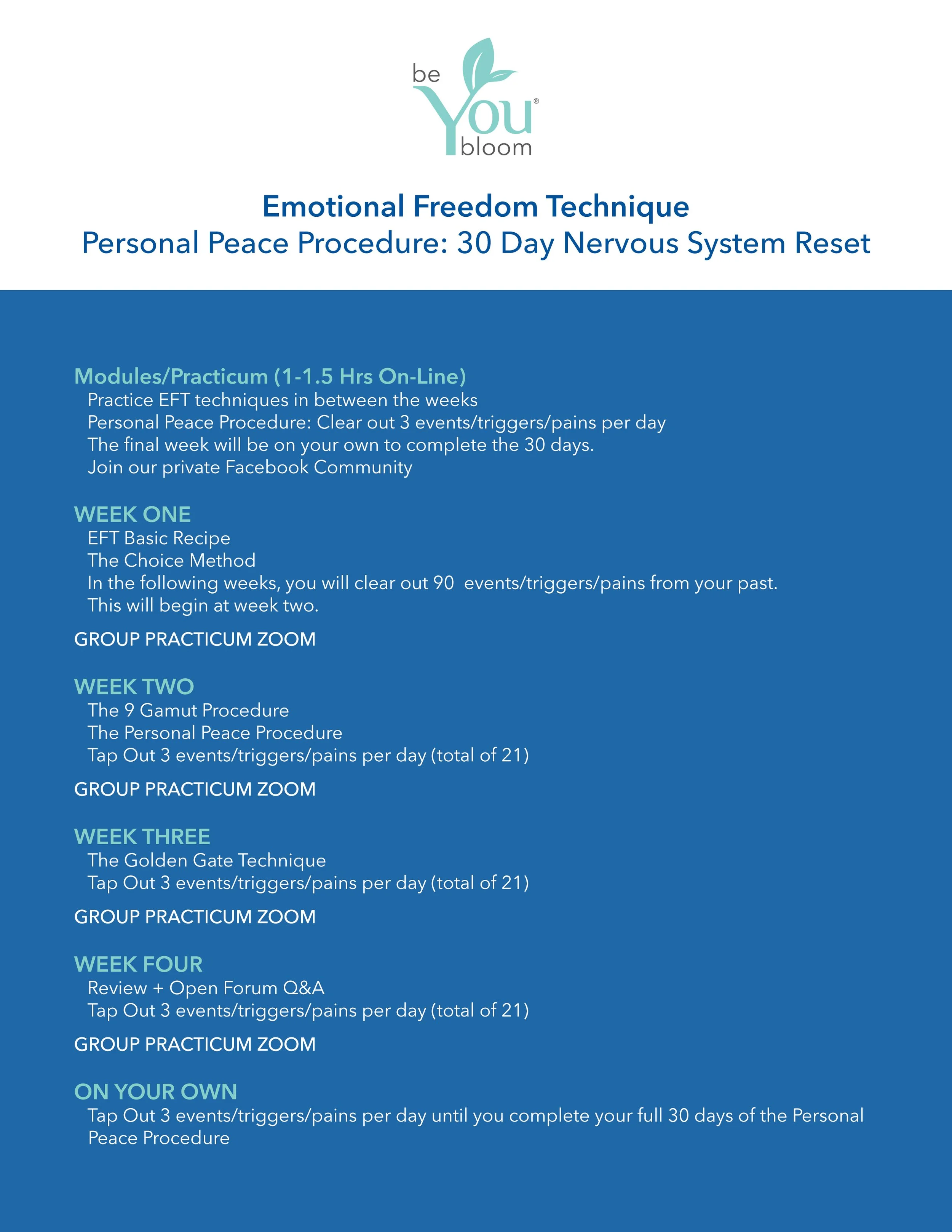 Over 30 days, you will personally clear 90 triggering events from your life, offering you a fresh start with a renewed mind. This process feels like a rebirth and a sweeping clean of your entire nervous system.